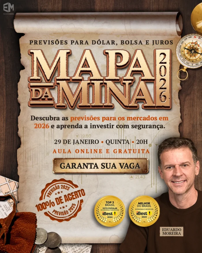 O Mapa da Mina é um encontro que só acontece uma vez por ano, onde Edu Moreira faz uma análise detalhada das projeções do mercado financeiro durante os próximos 12 meses, de forma simples e sem interesses escondidos. Nada de previsões fantasiosas da Faria Lima, nem armadilhas de banco.